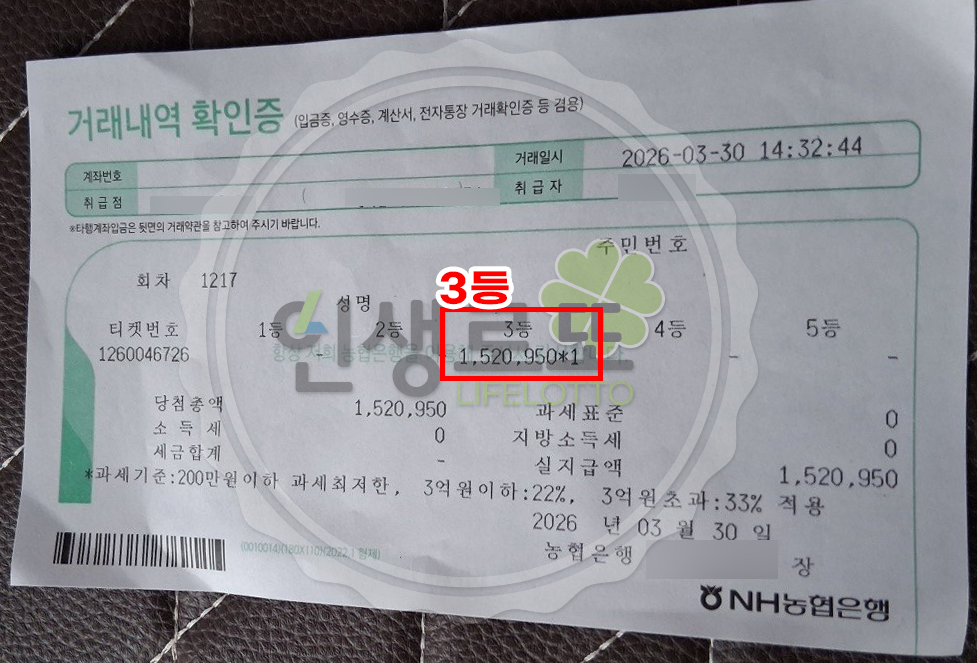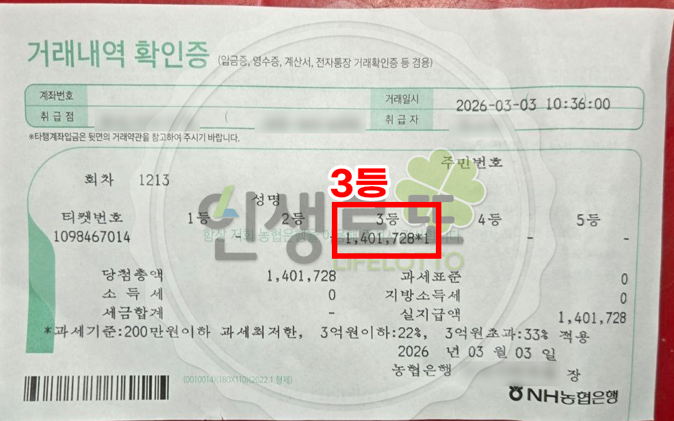 [2026년 03월 14일 제 1215회] 19억 1등 당첨자 영수증