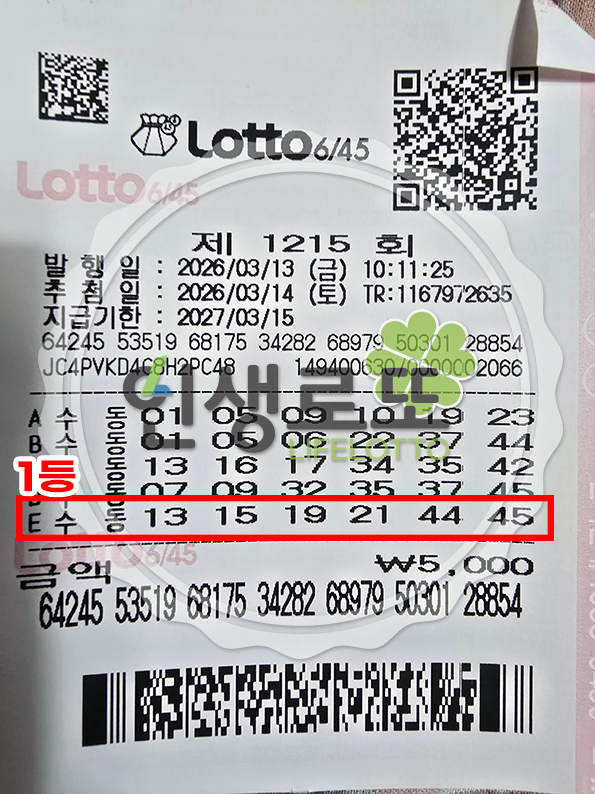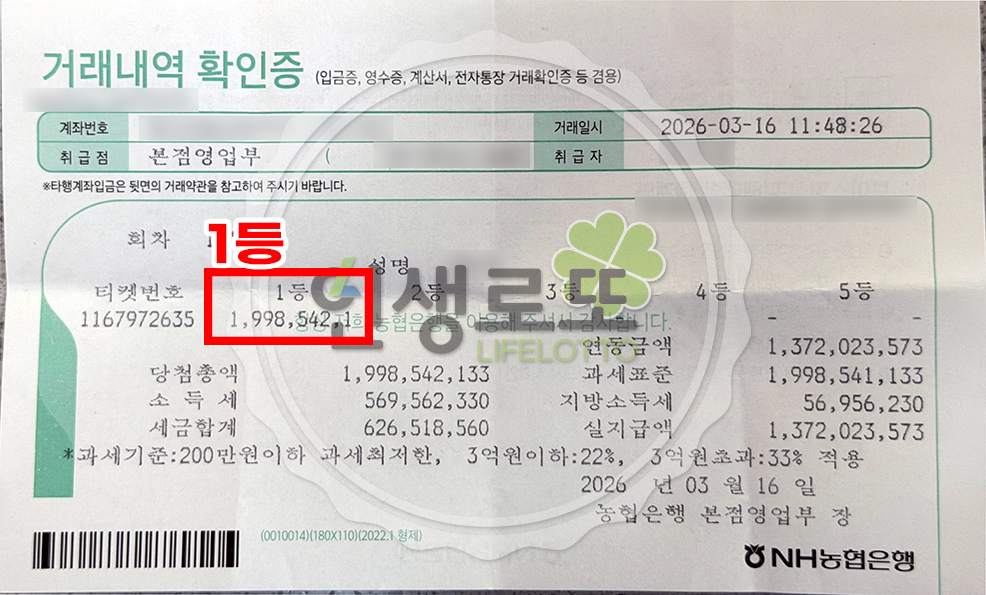 [2026년 03월 14일 제 1215회] 19억 1등 당첨자 영수증